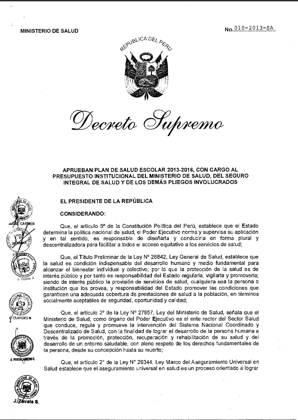 Decreto Supremo N° 010-2013-SA, que aprueba el Plan de Salud Escolar 2013-2016