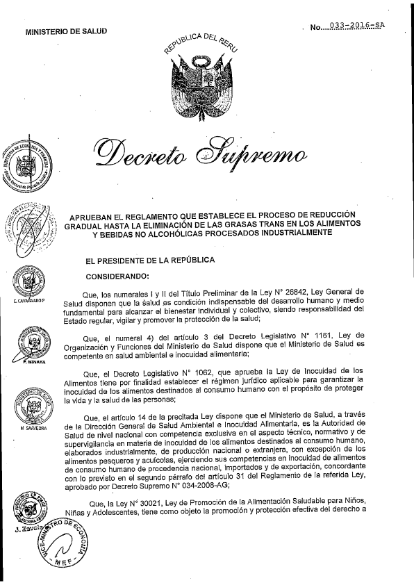 Decreto Supremo N.º 033-2016-SA - Proceso de reducción de grasas trans en alimentos procesados.