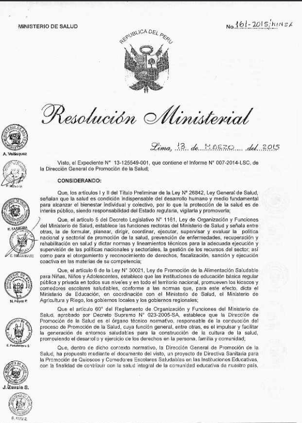 Resolución Ministerial N° 161-2015/MINSA: Directiva Sanitaria N° 063 -MINSA/DGPS-V.01: Directiva Sanitario para la Promoción de Quioscos y Comedoras Escolares Saludables en las Instituciones Educativas