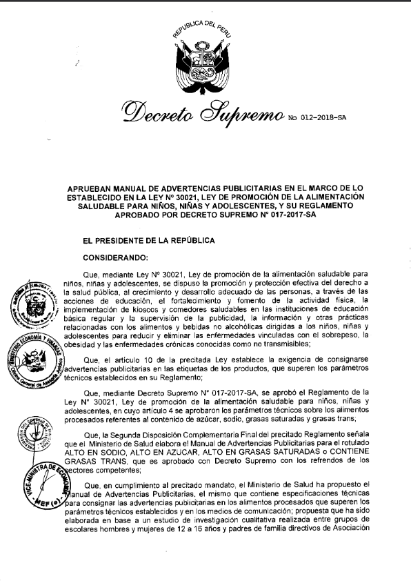 Decreto Supremo N° 012-2018-SA - Manual de Advertencias Publicitarias.