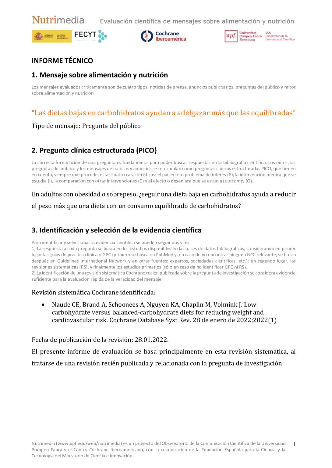 La evaluación realizada muestra que es probable que haya poca o ninguna diferencia en la pérdida de peso entre las personas que siguen dietas bajas en carbohidratos y las que siguen dietas equilibradas en carbohidratos, mantenidas durante un máximo de dos años.