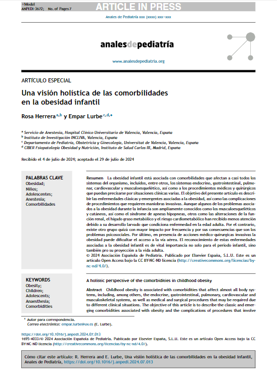 La obesidad infantil está asociada con comorbilidades que afectan a casi todos los sistemas del organismo, incluidos, entre otros, los sistemas endocrino, gastrointestinal, pulmonar, cardiovascular y musculoesquelético, así como a los procedimientos médicos y quirúrgicos que puedan precisarse por situaciones clínicas varias. El objetivo del presente artículo es describir las enfermedades clásicas y emergentes asociadas a la obesidad, así como las complicaciones de procedimientos que requieren maniobras invasivas. Aunque algunos de los problemas asociados a la obesidad durante la infancia son ampliamente conocidos como los musculoesqueléticos y cutáneos, así como el síndrome de apneas hipopneas, otros como las alteraciones de la función renal, el hígado graso metabólico y el riesgo cardiometabólico han recibido menos atención debido a su desarrollo larvado que condiciona enfermedad en la edad adulta. Por el contrario, existe otro grupo quizá con mayor impacto por frecuencia y por sus consecuencias que son los problemas psicosociales. Por último, en presencia de acciones médico-quirurgicas invasivas la obesidad puede dificultar el acceso a la vía aérea. El reconocimiento de estas enfermedades asociadas a la obesidad infantil es de vital importancia no solo para el periodo infantil, sino también pro su proyección a la vida adulta.