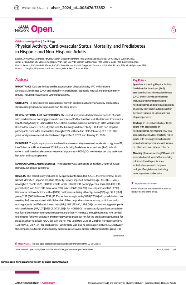 En este estudio de cohorte de adultos estadounidenses hispanos o latinos y no hispanos, los niveles más bajos de actividad física moderada a vigorosa se asociaron con enfermedad cardiovascular o mortalidad entre los participantes con normoglucemia, pero no entre los participantes con prediabetes. Los adultos con prediabetes pueden beneficiarse de la reducción del comportamiento sedentario y la mejora de múltiples factores del estilo de vida más allá de mejorar la actividad física moderada a vigorosa por sí sola.
