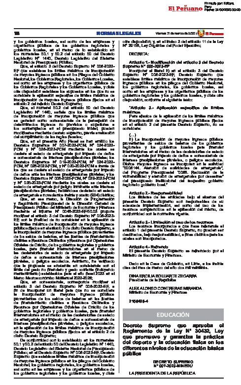 Decreto Supremo N.º 007-2023-MINEDU – que aprueba el Reglamento de la Ley N° 30432, Ley que promueve y garantiza la práctica del deporte y la educación física en los diferentes niveles de la educación básica pública.