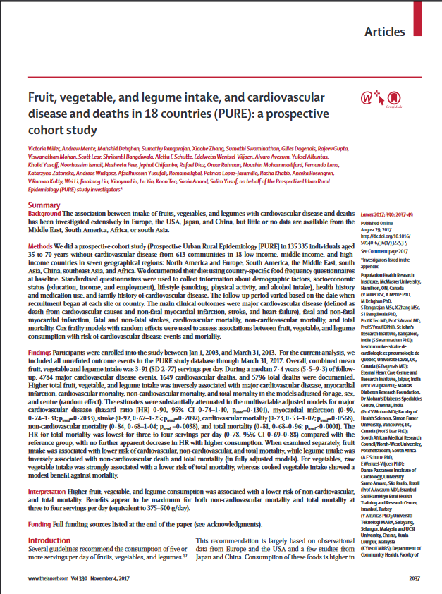 Consumo de frutas, verduras y legumbres, y enfermedades cardiovasculares y muertes en 18 países (PURE): un estudio de cohorte prospectivo