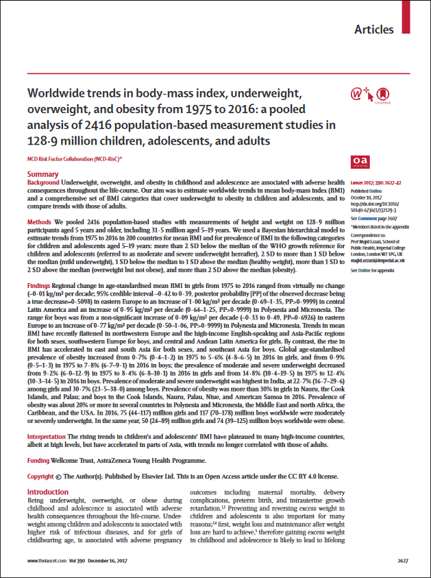Worldwide trends in body-mass index, underweight, overweight, and obesity from 1975 to 2016: a pooled analysis of 2416 population-based measurement studies in 128·9 million children, adolescents, and adults