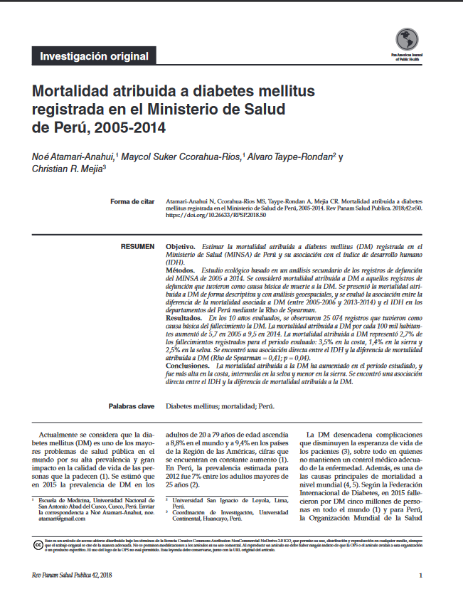 Actualmente se considera que la diabetes mellitus (DM) es uno de los mayores problemas de salud pública en el mundo por su alta prevalencia y gran impacto en la calidad de vida de las personas que la padecen. Se estimó que en 2015 la prevalencia de DM en los adultos de 20 a 79 años de edad ascendía a 8,8% en el mundo y a 9,4% en los países de la Región de las Américas, cifras que se encuentran en constante aumento. En Perú, la prevalencia estimada para 2012 fue 7% entre los adultos mayores de 25 años.