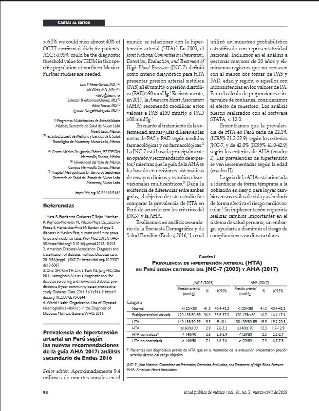 Señor editor: Aproximadamente 9.4 millones de muertes anuales en el mundo se relacionan con la hipertensión arterial (HTA).1 En 2003, el Joint National Committee on Prevention, Detection, Evaluation, and Treatment of High Blood Pressure (JNC-7) definió como criterio diagnóstico para HTA presentar presión arterial sistólica (PAS) ≥140 mmHg o presión diastólica (PAD) ≥90 mmHg.2 Recientemente, en 2017, la American Heart Association (AHA) recomendó modificar estos valores a PAS ≥130 mmHg o PAD ≥80 mmHg.3