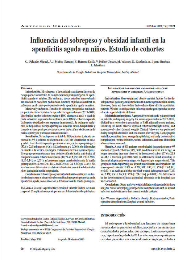 El sobrepeso y la obesidad constituyen factores de riesgo para el desarrollo de complicaciones postquirúrgicas en apendicitis aguda en adultos. Sin embargo, pocos estudios han evaluado sus efectos en pacientes pediátricos. Nuestro objetivo es analizar su influencia en el curso postoperatorio de la apendicitis aguda en niños.