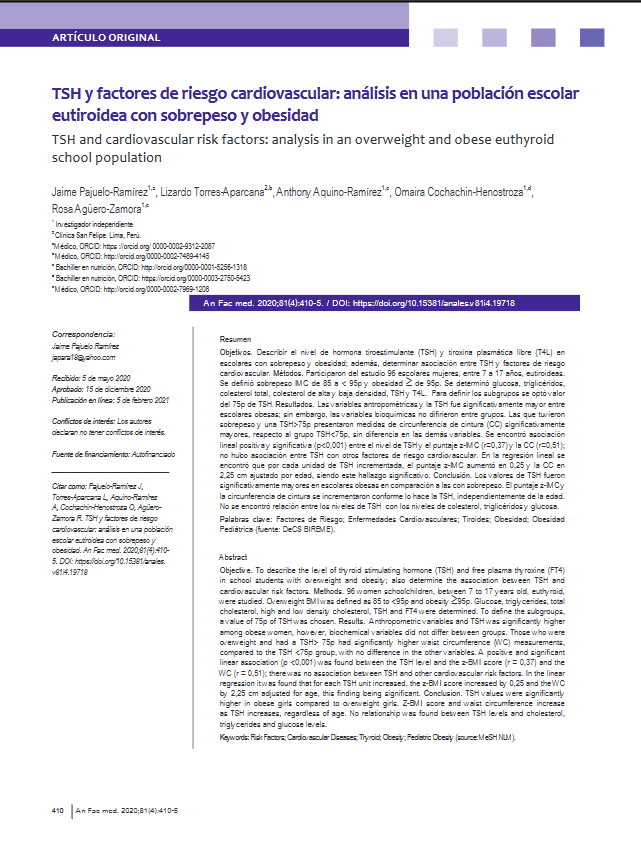 En los últimos años, la obesidad en el Perú se ha incrementado tanto en niños, adolescentes y adultos. La historia natural de esta enfermedad produce en el tiempo una elevada morbimortalidad por la frecuente asociación con otras enfermedades que aumentan el riesgo cardiovascular como la diabetes mellitus tipo 2, dislipidemias e hipertensión arterial. En años recientes, existe un enfoque creciente en conocer la relación que existe entre la función tiroidea y el estado de peso, conociendo que el hipertiroidismo lleva a la pérdida de peso y el hipotiroidismo se asocia con aumento del mismo. En ese sentido no está claro si esta función tiroidea alterada es la causa o consecuencia del exceso de grasa en el cuerpo.