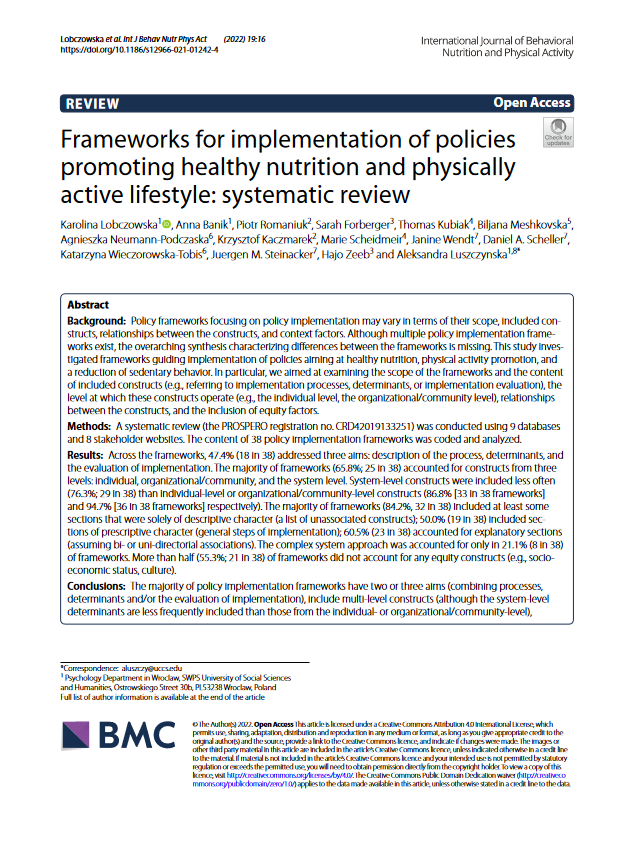 Marcos para la implementación de políticas que promuevan una nutrición saludable y un estilo de vida físicamente activo: revisión sistemática