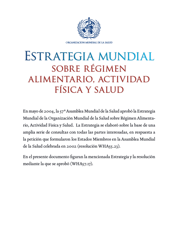 En mayo de 2004, la 57ª Asamblea Mundial de la Salud aprobó la Estrategia Mundial de la Organización Mundial de la Salud sobre Régimen Alimentario, Actividad Física y Salud. La Estrategia se elaboró sobre la base de una amplia serie de consultas con todas las partes interesadas, en respuesta a la petición que formularon los Estados Miembros en la Asamblea Mundial de la Salud celebrada en 2002 (resolución WHA55.23). En el presente documento figuran la mencionada Estrategia y la resolución mediante la que se aprobó (WHA57.17)