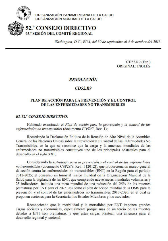 Documento que aprueba el Plan de acción para prevenir y controlar las enfermedades no transmisibles 2013-2019