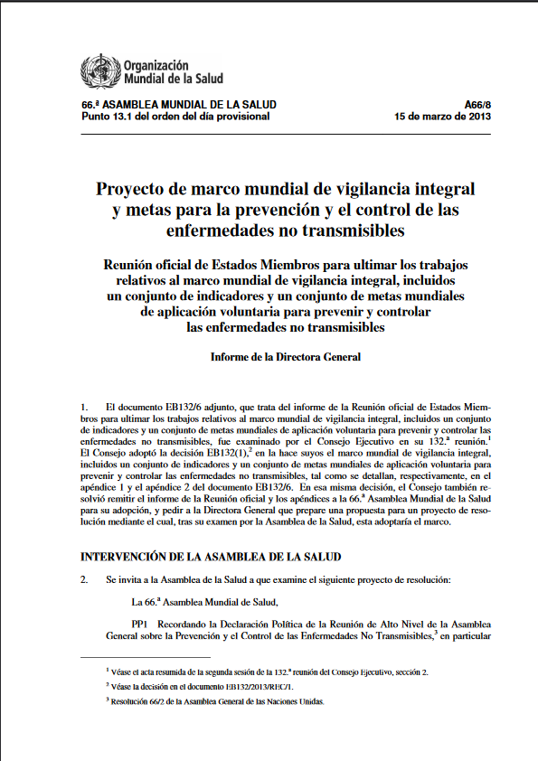 Proyecto de marco mundial de vigilancia integral y metas para la prevención y el control de las enfermedades no transmisibles (2013)