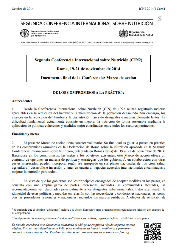 El presente Marco de acción tiene carácter voluntario. Su finalidad es guiar la puesta en práctica de los compromisos asumidos en la Declaración de Roma sobre la Nutrición aprobada en la Segunda Conferencia Internacional sobre Nutrición, celebrada en Roma (Italia) del 19 al 21 de noviembre de 2014. Basándose en los compromisos, las metas y los objetivos existentes, este Marco de acción ofrece un conjunto de opciones en materia de política y estrategias que los gobiernos1 , en colaboración con otras partes interesadas, pueden incorporar según sea apropiado en sus planes nacionales de nutrición, salud, agricultura2 , desarrollo e inversión y tener en cuenta al negociar acuerdos internacionales encaminados a mejorar la nutrición para todos.